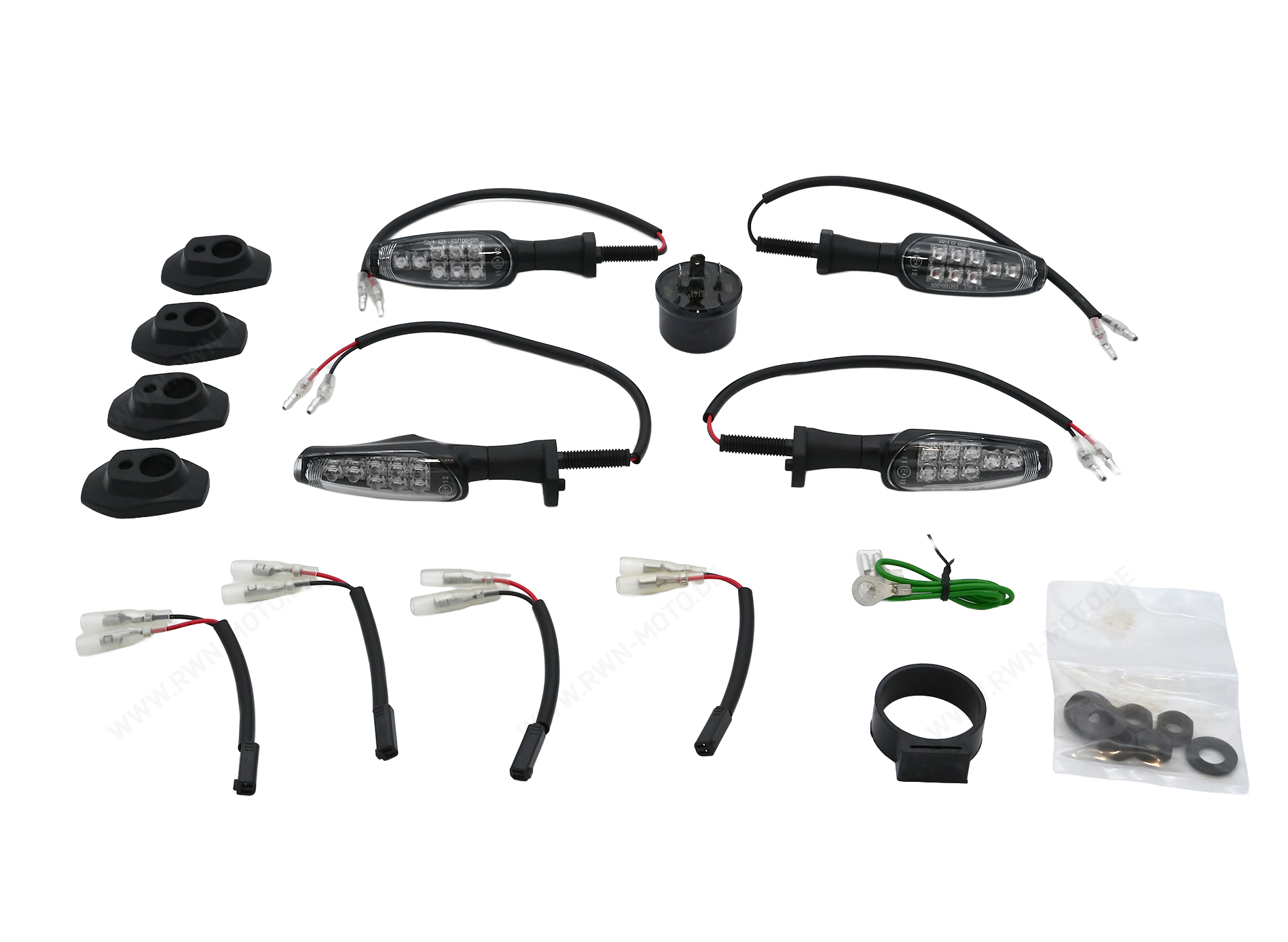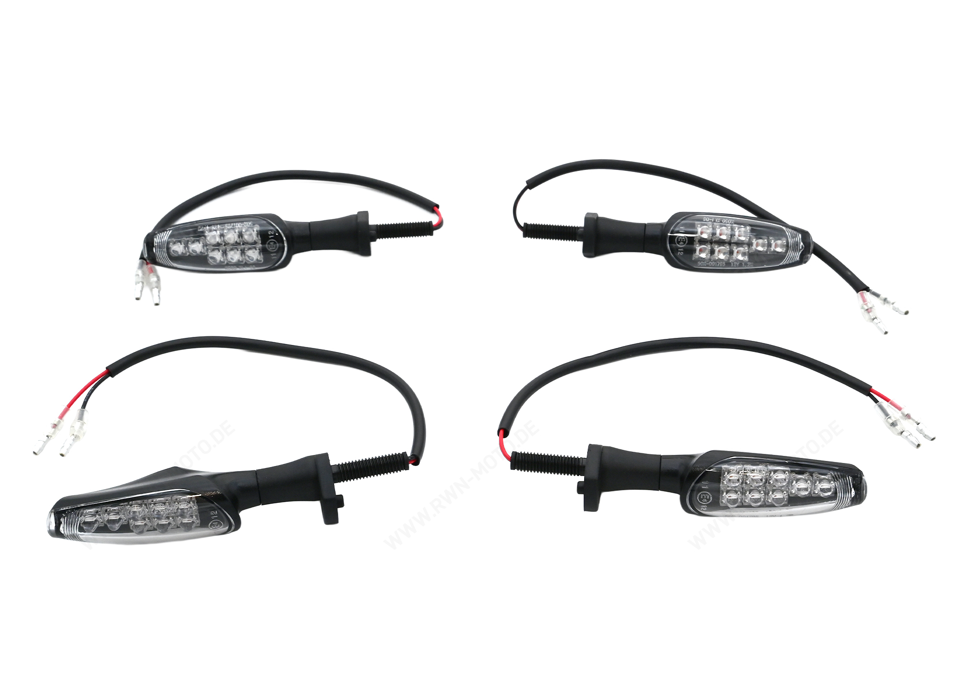 Clignotants à LED high-tech. Le set se compose de deux clignotants pour l'avant et de deux clignotants pour l'arrière, câbles et relais inclus. Faible consommation de courant de 1,2 watt par clignotant. 8 LED très lumineuses par clignotant.