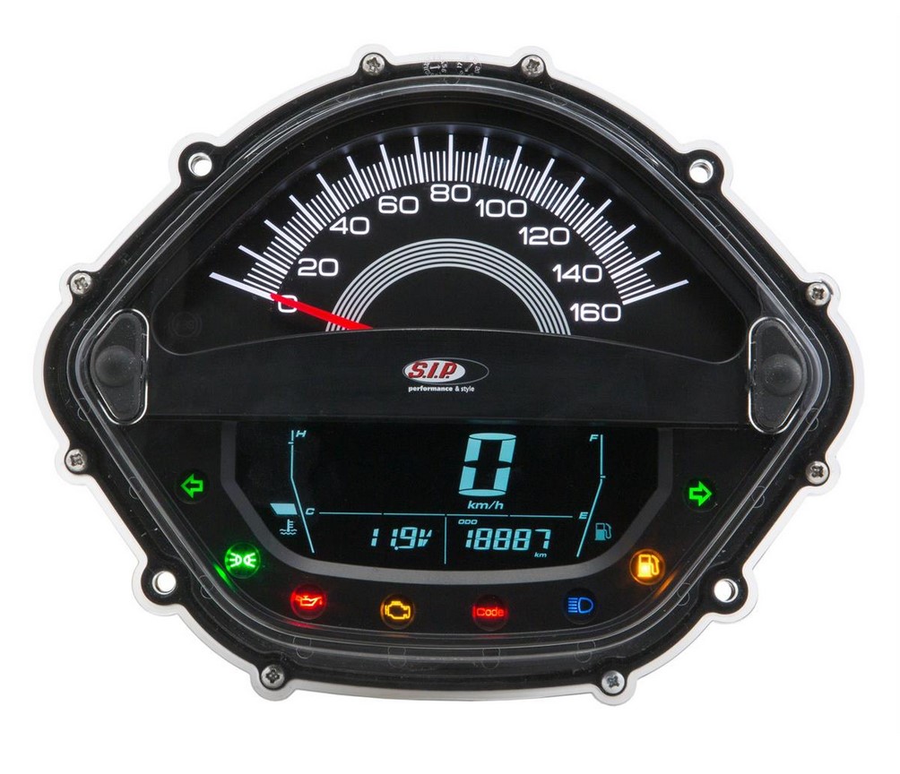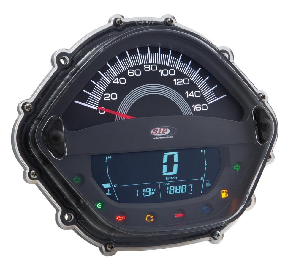 Le tachymètre / compte-tours SIP remplace le compteur de vitesse très peu équipé de série par un véritable appareil multifonctions. Le tachymètre se distingue par son grand affichage analogique de la vitesse (jusqu'à 160kmh) et du régime (jusqu'à 16.000 tr/min). L'aiguille du tachymètre indique donc soit le nombre de tours, soit la vitesse. L'écran numérique inférieur peut afficher 18 fonctions au choix. Il suffit d'appuyer sur un bouton pour les changer. Outre les fonctions standard telles que l'affichage analogique/numérique de la vitesse, le kilométrage journalier & total, la température, le tachymètre dispose d'un compte-tours analogique & numérique, d'un affichage numérique de l'essence et de la température, d'un accéléromètre pour les distances et la mesure de la vitesse, de la vitesse moyenne et de nombreuses autres caractéristiques (voir liste des fonctions). Le rétroéclairage peut être choisi parmi huit couleurs différentes. La luminosité peut également être réglée séparément. Avant chaque redémarrage, l'instrument effectue un autotest complet. La prise de vitesse s'effectue comme à l'origine via la prise de vitesse intégrée au faisceau de câbles ou peut être transmise via un capteur de vitesse numérique. Les capteurs correspondants sont disponibles dans les accessoires. Un jeu de câbles pour le raccordement au véhicule est inclus dans la livraison. Il se branche entre le compteur de vitesse et le faisceau de câbles. Le tout sans soudure, en toute simplicité.
