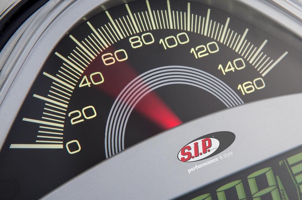 Le tachymètre / compte-tours SIP remplace le tachymètre très peu équipé de série par un véritable appareil multifonctions. Le tachymètre se distingue par son grand affichage analogique de la vitesse (jusqu'à 160kmh) et du régime (jusqu'à 16.000 tr/min). L'aiguille du tachymètre indique donc soit le nombre de tours, soit la vitesse. L'écran numérique inférieur peut afficher 18 fonctions au choix. Il suffit d'appuyer sur un bouton pour les changer. Outre les fonctions standard telles que l'affichage analogique/numérique de la vitesse, le kilométrage journalier & total, la température, le tachymètre dispose d'un compte-tours analogique & numérique, d'un affichage numérique de l'essence et de la température, d'un accéléromètre pour les distances et la mesure de la vitesse, de la vitesse moyenne et de nombreuses autres caractéristiques (voir liste des fonctions). Le rétroéclairage peut être choisi parmi huit couleurs différentes. La luminosité peut également être réglée séparément. Avant chaque redémarrage, l'instrument effectue un autotest complet. La prise de vitesse s'effectue comme à l'origine via la prise de vitesse intégrée au faisceau de câbles ou peut être transmise via un capteur de vitesse numérique. Les capteurs correspondants sont disponibles dans les accessoires. Un jeu de câbles pour le raccordement au véhicule est inclus dans la livraison. Il se branche entre le compteur de vitesse et le faisceau de câbles. Le tout sans soudure, en toute simplicité.