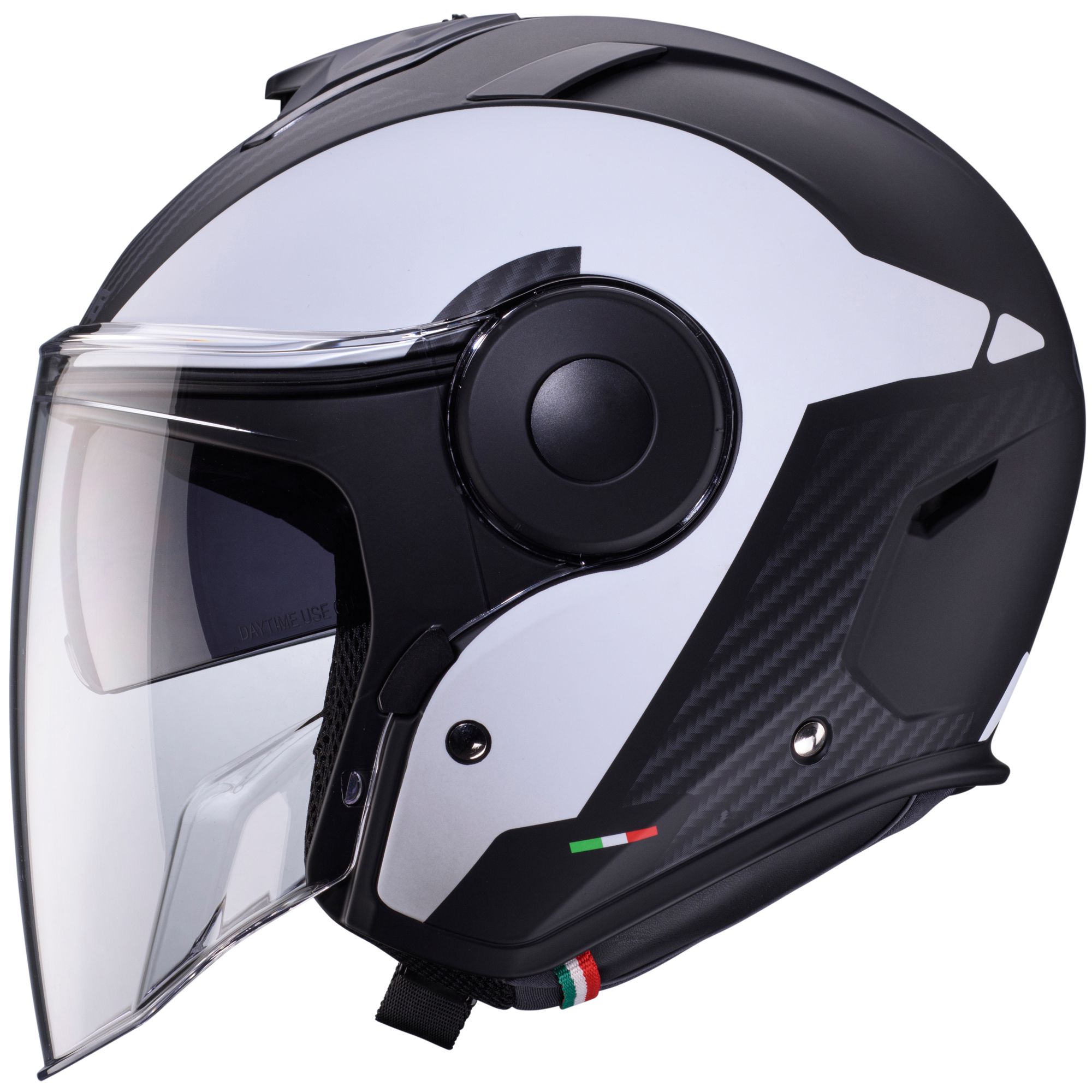 Le casque jet Caberg Soho avec le décor Milano dans les couleurs noir mat/blanc dispose des caractéristiques suivantes :