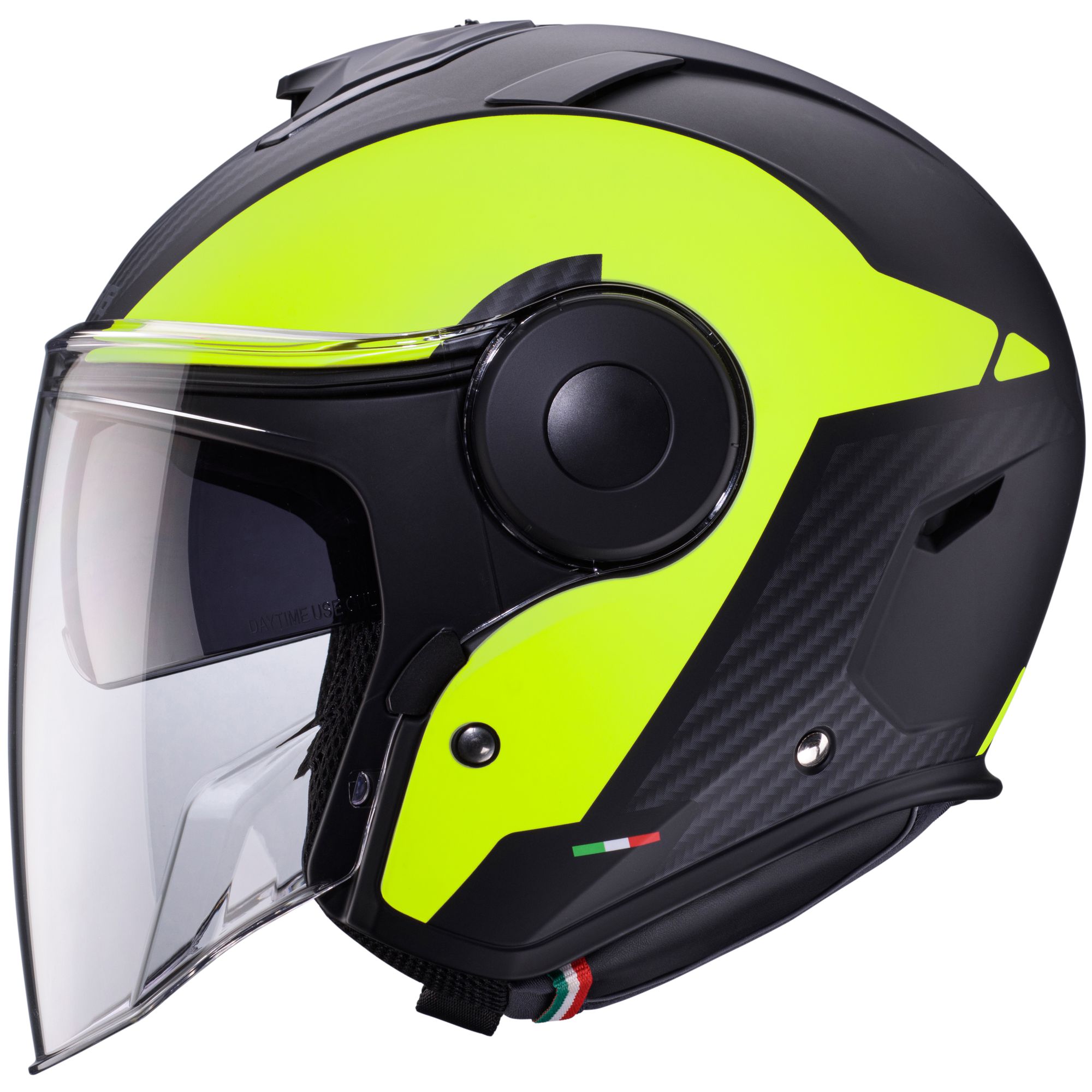 Le casque jet Caberg Soho avec le décor Milano dans les couleurs noir mat/jaune fluo possède les caractéristiques suivantes :