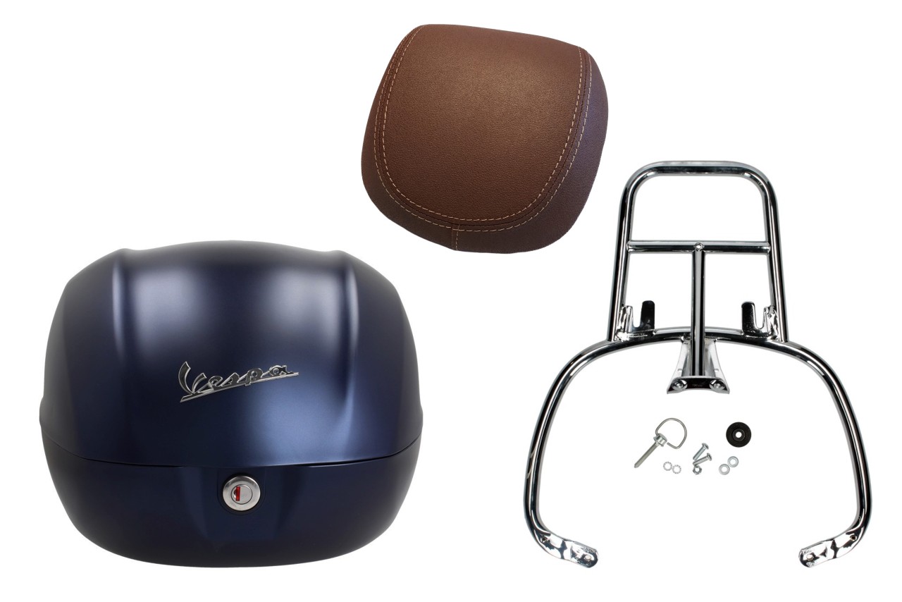 Informations sur le produit "Kit top case 32L bleu foncé mat opaque (288/A), coussin dorsal marron foncé pour Vespa Primavera"