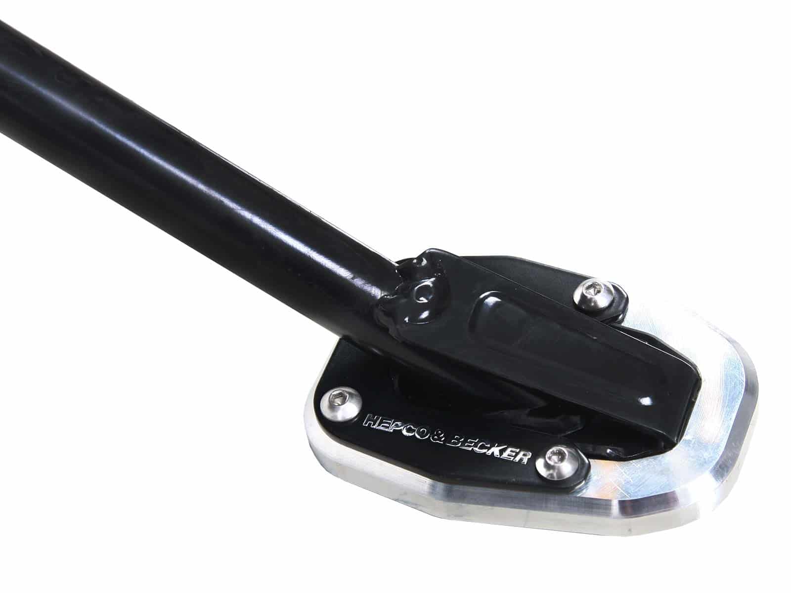 Surtout lorsqu'elle est chargée ou sur un terrain non stabilisé, la moto risque de s'enfoncer et de basculer sur la béquille latérale. Pour éviter ce danger à ta moto, il est recommandé d'utiliser une plaque de béquille latérale spécifique au modèle et fraisée de Hepco & Becker. Grâce à l'augmentation de la surface de la béquille latérale, qui est environ deux fois plus grande que celle de la béquille d'origine, protège parfaitementta moto contre les mésaventures lors de l'arrêt ou du stationnement.
