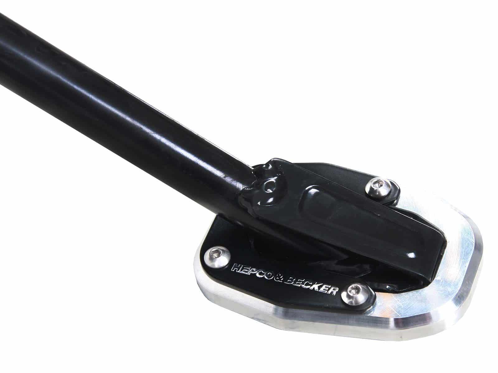 Surtout lorsqu'elle est chargée ou sur un terrain non stabilisé, la moto risque de s'enfoncer et de basculer sur la béquille latérale. Pour éviter ce danger à ta moto, il est recommandé d'utiliser une plaque de béquille latérale spécifique au modèle et fraisée de Hepco & Becker. Grâce à l'augmentation de la surface de la béquille latérale, qui est environ deux fois plus grande que celle de la béquille d'origine, protège parfaitementta moto contre les mésaventures lors de l'arrêt ou du stationnement.