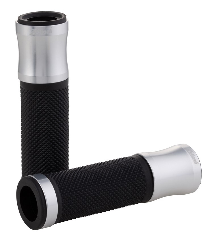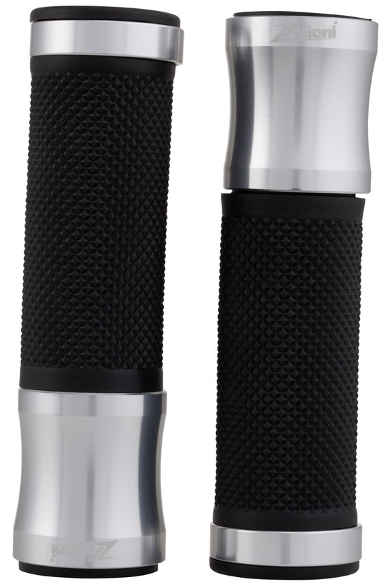 Poignée ergonomique avec paume caoutchoutée. Capsules en aluminium avec logo ZELIONI gravé au laser. Extrémités ouvertes pour le montage de poids/rétroviseurs sur le guidon.
