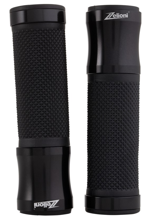 Poignée ergonomique avec paume caoutchoutée. Capsules en aluminium avec logo ZELIONI gravé au laser. Extrémités ouvertes pour le montage de poids/rétroviseurs sur le guidon.