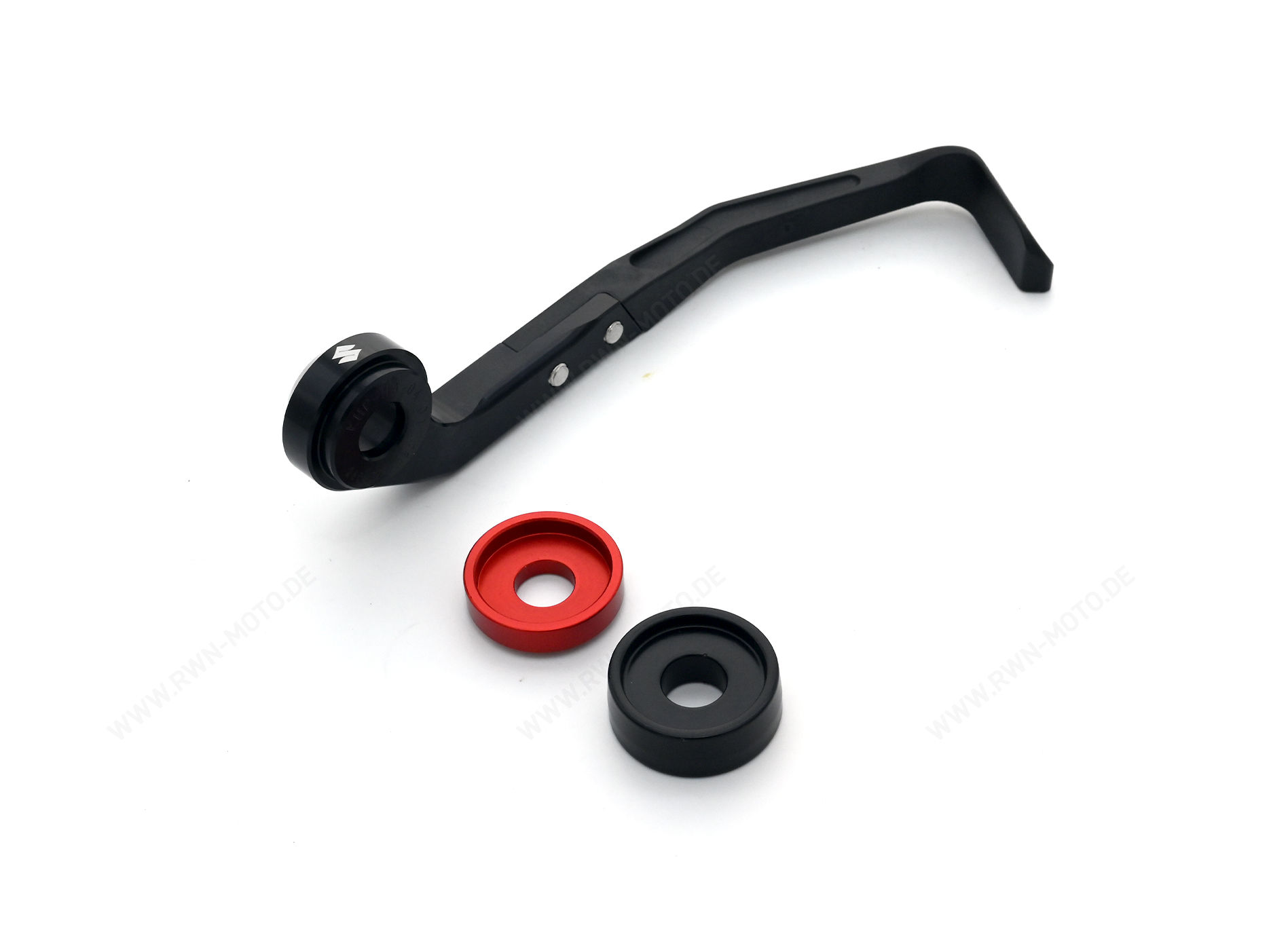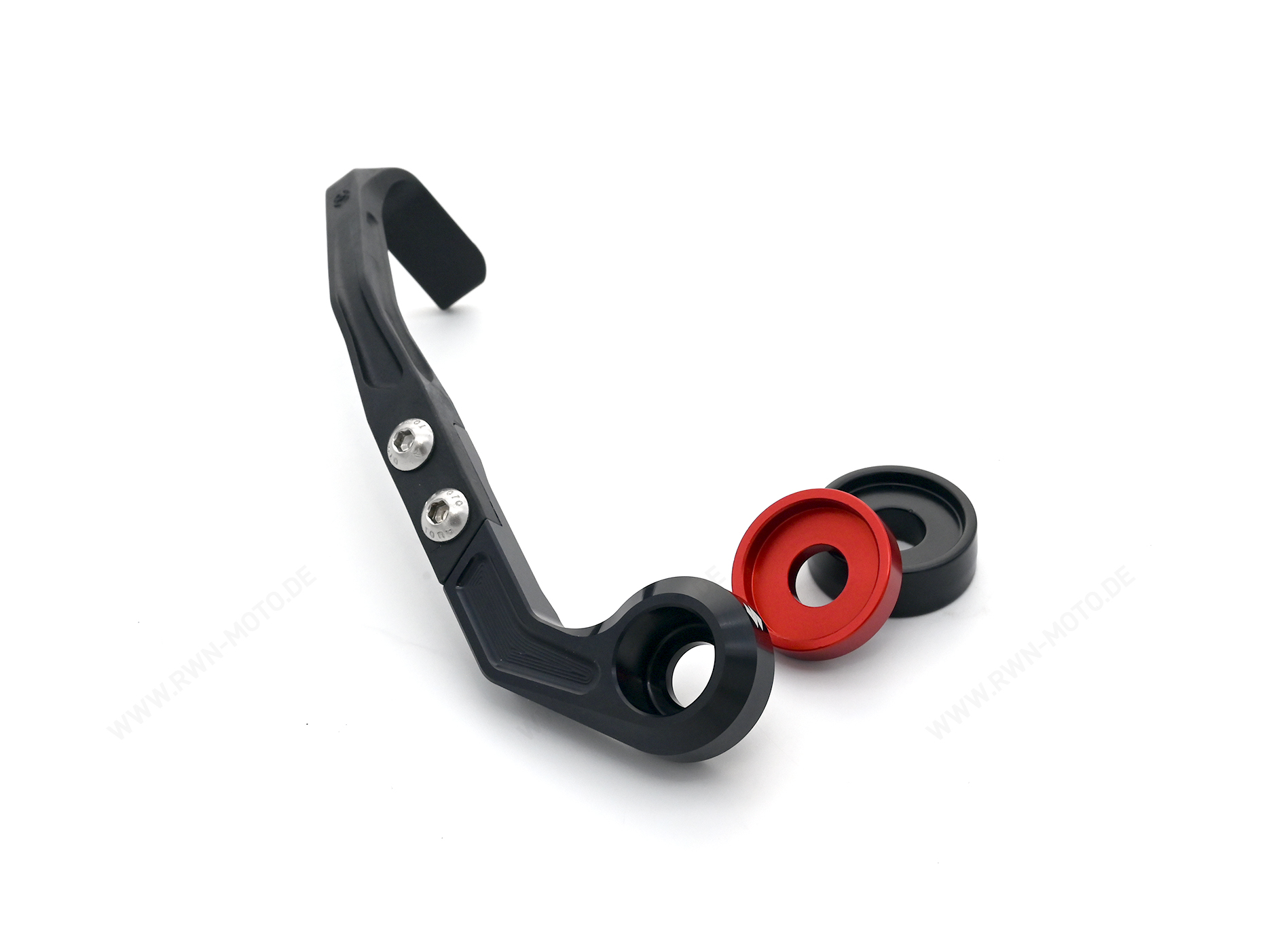Le corps principal est en aluminium fraisé CNC de haute qualité, le protecteur lui-même est en plastique résistant. Grâce à ce mélange de matériaux, le protecteur atteint un niveau optimal de stabilité et de flexibilité. Le design incliné vers le bas offre suffisamment de place pour positionner individuellement sa main sur la poignée. Des entretoises rouges sont comprises dans la livraison.