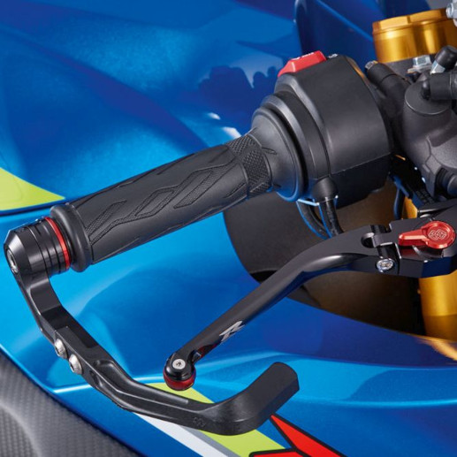 Le corps principal est en aluminium fraisé CNC de haute qualité, le protecteur lui-même est en plastique résistant. Grâce à ce mélange de matériaux, le protecteur atteint un niveau optimal de stabilité et de flexibilité. Le design incliné vers le bas offre suffisamment de place pour positionner individuellement sa main sur la poignée. Des entretoises rouges sont comprises dans la livraison.