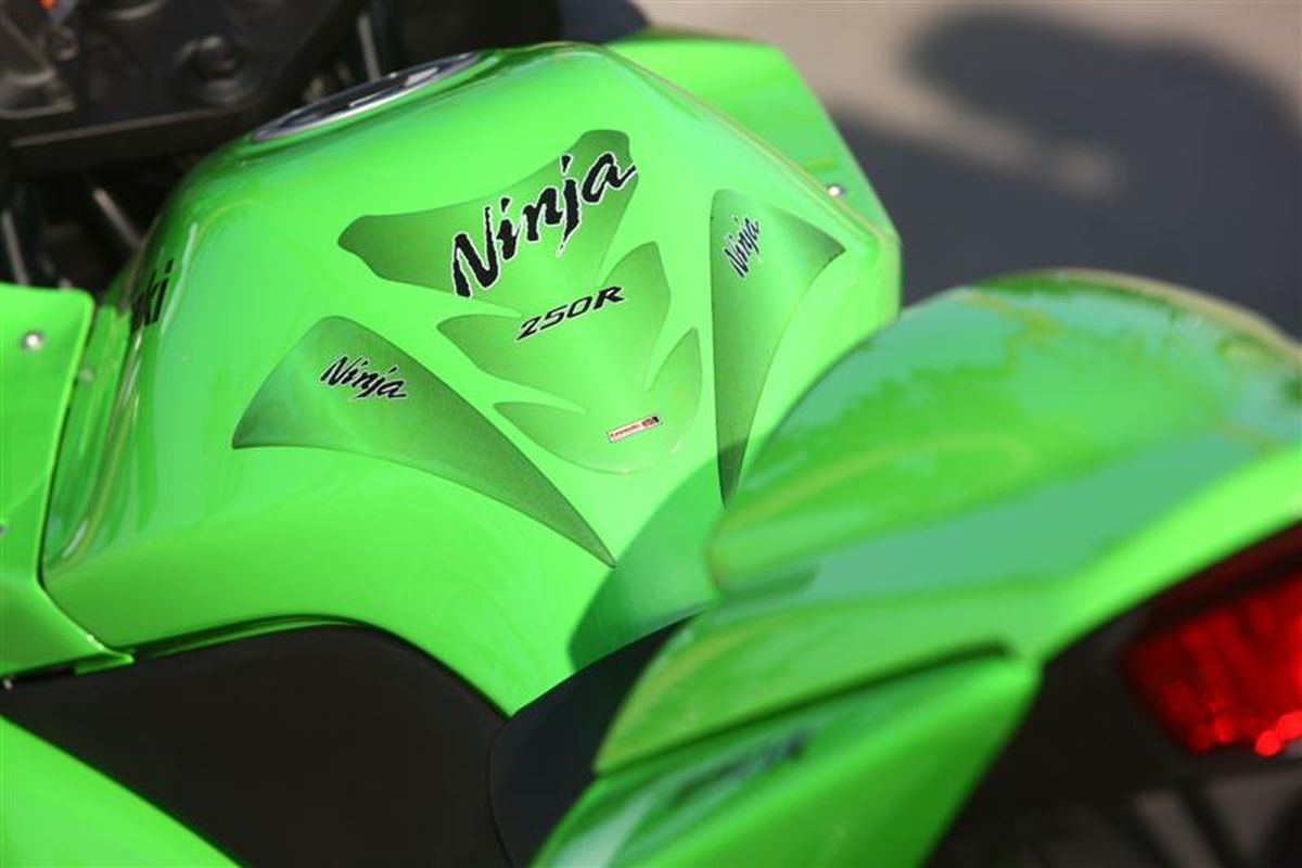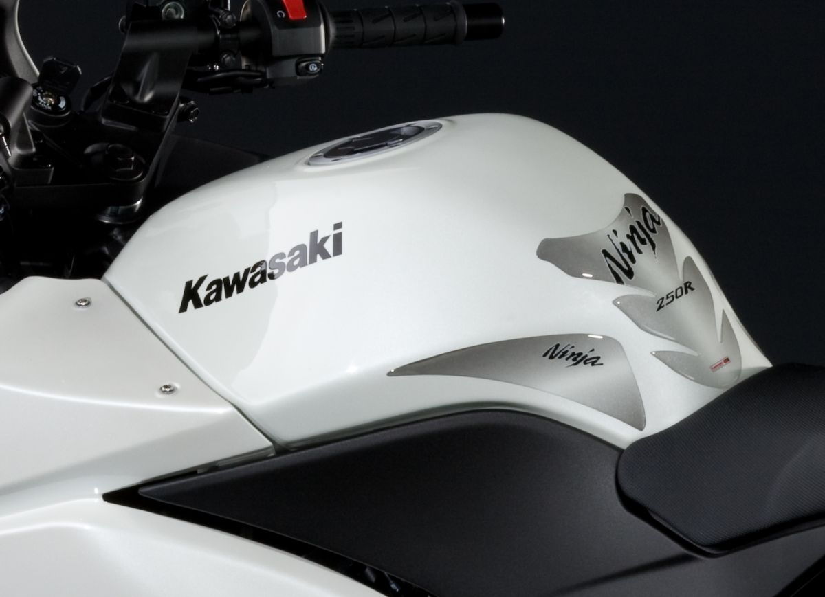 Protection de réservoir autocollante en résine gel de première classe. Unique et en trois parties, avec le logo Ninja 250R, semi-transparente, laisse apparaître la couleur originale du réservoir.