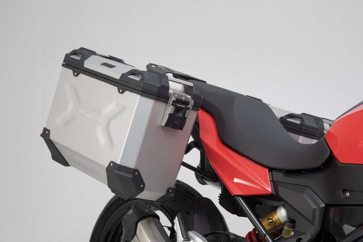Les valises en aluminium robustes TRAX ADV se sentent à l'aise sur tous les parcours : des gaufrages design renforcent la stabilité du matériau des parois en aluminium soudé de 1,5 millimètre d'épaisseur. Un couvercle entièrement amovible avec des poignées de transport en aluminium anodisé et des fermetures rapides facilite le chargement et le déchargement des valises moto, le bord latéral biseauté donne une grande garde au sol dans les virages. Avec cette solution complète, tu as tous les composants nécessaires pour partir directement en grand voyage avec TRAX : Deux valises latérales étanches TRAX ADV, deux supports latéraux amovibles SW-MOTECH, un kit d'adaptation, un jeu de serrures, un limiteur d'ouverture et un antivol pour un prix total attractif. Les supports spécifiques au modèle et la taille des valises sont parfaitement adaptés à la géométrie arrière et au système d'échappement de la moto.